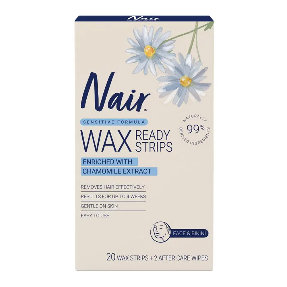 Nair Sensitive Formula Wax Ready Strips Chamomile Extract – Face & Bikini 20 Pack are specially formulated for people who want to quickly and precisely remove unwanted hair from the body or face. Formulated with 99% naturally derived ingredients, these ready-to-use wax strips provide a simple and effective way to remove unwanted hair from the face, underarms, and bikini area. Infused with soothing chamomile extract and nourishing oils, they help to care for your skin while delivering smooth, long-lasting results.